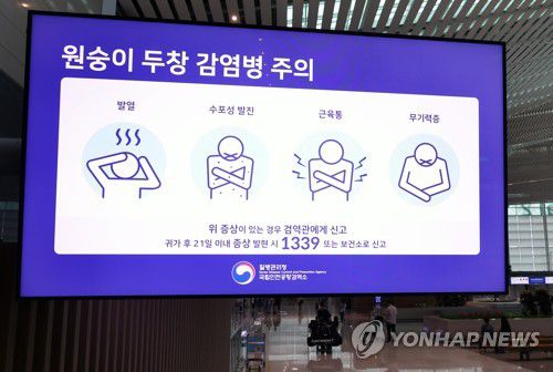 지난 6월 23일 영종도 인천국제공항 제2여객터미널 모니터에 '원숭이두창 감염병 주의' 안내문이 표시되고 있다. [연합뉴스 자료사진] |