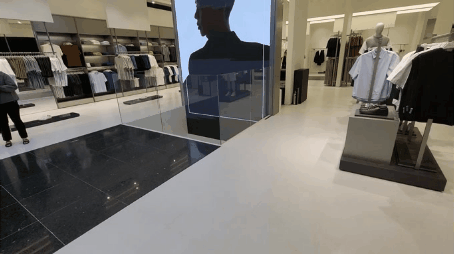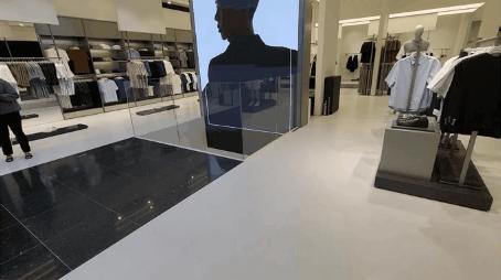 정식 개장일 하루 전인 30일 오전 10시 무신사 스탠다드 강남점에 들어섰을 때 시선을 끄는 건 압도적 크기 미디어월이었다. 매장 중앙에 위치해 3차원(3D) 미디어 아트를 보여주는데, 기둥에서부터 천장까지 길이는 14m에 달한다. 무채색 인테리어에 맞춰 보다 모던한 분위기를 자아내는 역할을 한다. 영상엔 지난 10일 무신사가 선보인 가상인간 '무아인'도 등장하는 데 맛보기 정도로만 모습을 확인할 수 있다.
