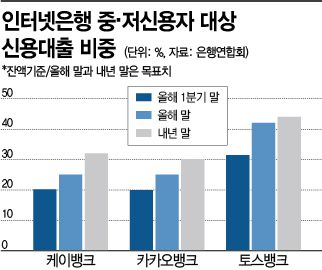 1일 은행연합회에 따르면 인터넷은행들의 올해 연말까지 중·저신용자 대출 비중 목표치는 카카오뱅크와 케이뱅크가 각각 25%, 토스뱅크가 42%다. 내년 말까지 이 비중을 다시 카카오뱅크 30%, 케이뱅크 32%, 토스뱅크는 44%까지 끌어올린다는 계획이다.