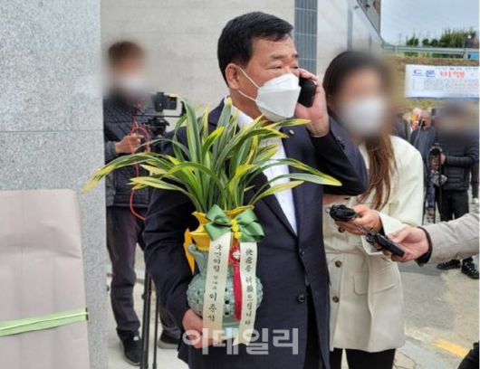 이준석 대표의 축하난을 들고 있는 박성민 전 당대표 비서실장 (사진=이데일리DB) |