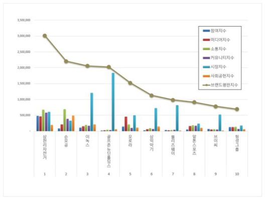 1위, 삼천리자전거 ( 대표 신동호 ) 브랜드는 참여지수 481,041 미디어지수 469,589 소통지수 672,976 커뮤니티지수 581,718 시장지수 609,689 사회공헌지수 200,001이 되면서 브랜드평판지수 3,015,015로 분석되었다.
