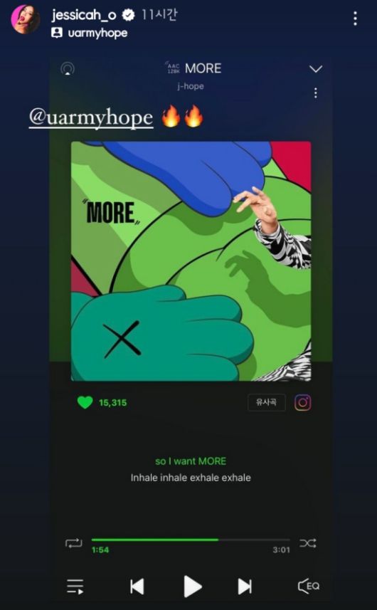 제시는 1일, 자신의 SNS 인스타그램 스토리에 불꽃 이모지와 함께 제이홉의 ‘모어’(MORE) 스트리밍 캡처 화면을 게재했다. 이를 본 제이홉도 제시의 게시물을 자신의 인스타그램 스토리에 올려 훈훈함을 자아냈다.