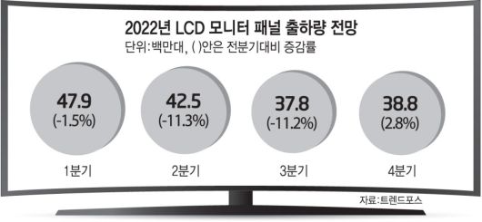 시장조사업체 트렌드포스에 따르면 2분기부터 LCD 모니터 제조사가 제품 판매량 목표치를 하향 조정하면서 패널 구매가 감소했다. 2분기 LCD 모니터 패널 출하량은 4250만대로 전분기 대비 11.3% 감소했다. 3분기도 11.2% 줄어들 것으로 전망된다. 4분기 소폭 회복세가 예상되지만 올해 전체 패널 출하량은 작년보다 3.5% 감소할 전망이다.