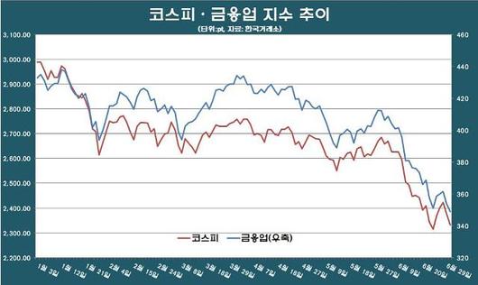 3일 한국거래소에 따르면 올 상반기(1~6월) 금융업 지수는 연초 432.96포인트에서 19.45%(84.21포인트) 감소한 348.75포인트까지 하락했다. 코스피 낙폭 대비 양호한 수준이다. 코스피는 같은 기간 2988.77포인트에서 21.95%(656.13포인트) 하락한 2332.64포인트까지 내려앉았다. 금융업 지수가 상대적으로 선방할 수 있었던 건 금융당국의 금리인상 기조 때문이다.