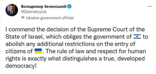 이스라엘 고등법원의 판결을 환영하는 젤렌스키 우크라이나 대통령의 트윗. |