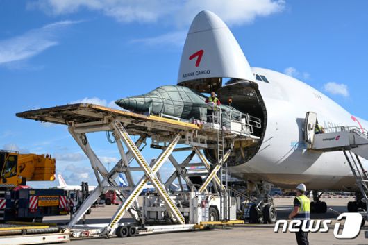 (서울=뉴스1) = 아시아나항공이 지난달 9일, 12일, 15일 총 3차례에 걸쳐 한국 공군 특수비행팀 블랙이글스의 T-50B항공기 9대를 영국 런던으로 운송했다고 4일 밝혔다. 사진은 블랙이글스 항공기 수송 작업하는 모습.(아시아나항공 제공)2022.7.4/뉴스1 [© 뉴스1코리아(news1.kr), 무단 전재 및 재배포 금지]