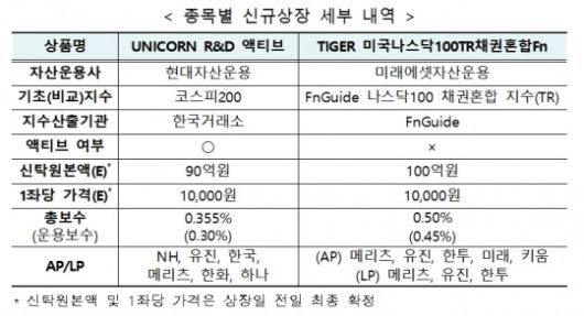 또 같은 날 미래에셋자산운용(대표 최창훈, 이병성)은 ‘TIGER 미국나스닥100TR채권혼합Fn’ ETF를 상장한다. 채권 비중 60%이상인 채권혼합형펀드다. 안전자산에 해당돼 퇴직연금의 투자제한이 적용되지 않고 100% 투자 가능하다. 주식과 채권이 혼합된 포트폴리오로 보수적이고 안정적 투자자에게 변동성을 낮춘 저위험 투자수단을 제공한다. 총수익지수(Total Return Index) ETF로서 분배금재투자로 분배금에 대한 과세 이연 및 복리 수익 획득이 가능하다.