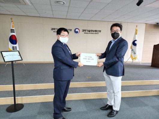 김윤호 LG유플러스 공정경쟁담당(왼쪽)이 이종혁 과기정통부 주파수할당팀장에게 주파수할당 신청서를 접수했다. |