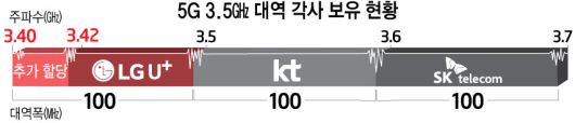 LG유플러스가 5세대(5G) 이동통신 주파수 3.4~3.42㎓ 대역 할당을 단독 신청했다. SK텔레콤과 KT는 고심 끝에 할당 신청을 하지 않기로 했다. 경매가 아닌 정부 심사 할당 절차를 거쳐 LG유플러스의 20㎒ 폭 추가주파수 단독 확보가 유력해졌다.