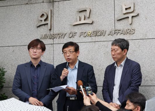 4일 오후 조현동 외교부 1차관 주재로 첫 회의가 열리는 일제 강제 징용 피해자 배상 관련 민관협의회에 참석하는 강제동원 소송 피해자 대리인단과 지원단이 서울 종로구 도렴동 외교부 청사 입구에서 입장을 밝히는 기자회견을 하고 있다. (사진=연합뉴스) |