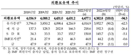 한국은행이 5일 발표한 외환보유액 통계를 보면 6월 말 기준 우리나라 외환보유액은 4382억8000만달러로 전월 말(4477억1000만달러)보다 94억3000만달러 감소했다. 글로벌 금융위기가 닥쳤던 시기인 2008년 11월(-117억5000만달러) 이후 13년 7개월 만에 가장 큰 감소폭을 기록했다. 한은은 “기타통화 외화자산의 미국 달러화 환산액과 금융기관의 예수금 감소와 더불어 외환시장 변동성을 완화하기 위한 조치 등에 기인했다”고 설명했다.