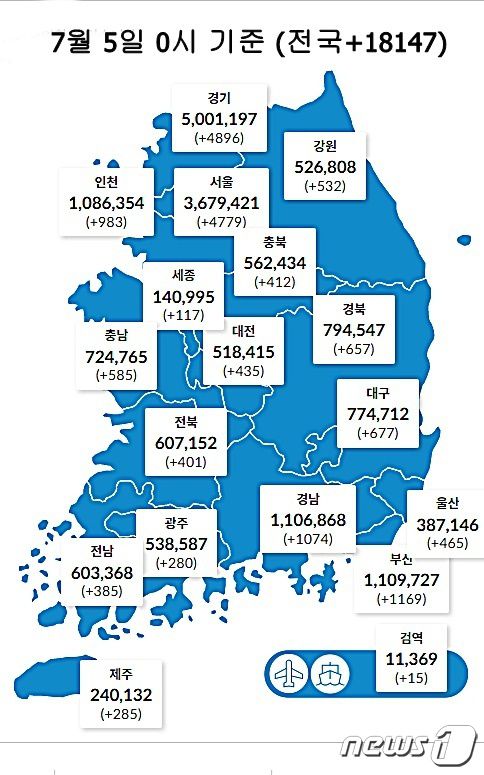 5일 0시 기준 대전 435명을 비롯해 전국에서 1만8147명의 코로나19 신규 확진자가 발생했다. (질병관리청 제공) ©뉴스1 |