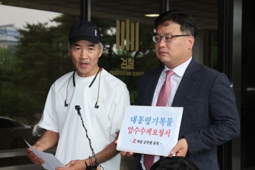 이씨의 친형 이래진씨와 법률대리인 김기윤 변호사는 5일 서울 서초동 서울중앙지검에서 기자회견을 열고 대통령 기록물 압수수색 요청서를 검찰에 제출했다.