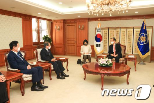 (서울=뉴스1) 박지혜 기자 = 한덕수 국무총리가 5일 오후 서울 종로구 정부서울청사에서 일본 경제단체연합회 회장단과 접견하고 있다. (총리실 제공) 2022.7.5/뉴스1