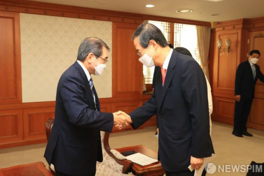 [서울=뉴스핌] 한덕수 국무총리(오른쪽)가 5일 오후 서울 종로구 정부서울청사에서 도쿠라 마사카즈 일본 경제단체연합회장과 만나 악수하고 있다. [사진=국무총리실] 2022.07.05 photo@newspim.com 저작권자(c) 글로벌리더의 지름길 종합뉴스통신사 뉴스핌(Newspim), 무단 전재-재배포 금지