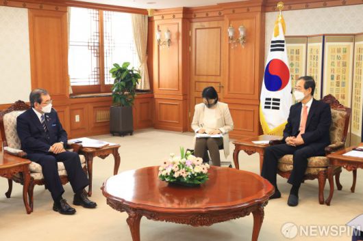 [서울=뉴스핌] 한덕수 국무총리가 5일 오후 서울 종로구 정부서울청사에서 도쿠라 마사카즈 일본 경제단체연합회장과 대화를 나누고 있다. [사진=국무총리실] 2022.07.05 photo@newspim.com 저작권자(c) 글로벌리더의 지름길 종합뉴스통신사 뉴스핌(Newspim), 무단 전재-재배포 금지