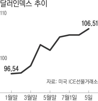 반면 유로화 가치는 20년 만에 최저 수준으로 떨어졌다. 유럽은 우크라이나 전쟁의 충격을 가장 직접적으로 받는 지역으로, 에너지 공급난이 심화하고 있다. 에너지 수출국인 미국과는 상황이 다르다. 이날 유로화는 달러당 1.03유로를 기록해 달러화와 유로화 가치가 등가를 나타내는 패리티에 근접했다. 국제금융센터는 “향후 경기 불확실성에 따른 안전자산 선호 강화, 연준의 공격적인 금리 인상 기조 등을 고려하면 달러화 강세는 쉽게 꺾이지 않을 전망”이라고 밝혔다.