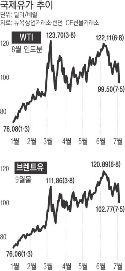 5일(현지시간) 뉴욕상업거래소(NYMEX)에서 8월 인도분 서부 텍사스산 원유(WTI)는 전 거래일보다 배럴당 8.2%(8.93달러) 떨어진 99.50달러에 거래를 마쳤다. WTI 가격이 배럴당 100달러 아래로 내려간 것은 지난 5월11일 이후 거의 두 달 만이다. 러시아·우크라이나 전쟁이 장기화하는 중에도 유가가 크게 내려간 것은 향후 경기 침체 내지 둔화로 에너지 수요가 함께 위축될 것이란 전망 때문이다.