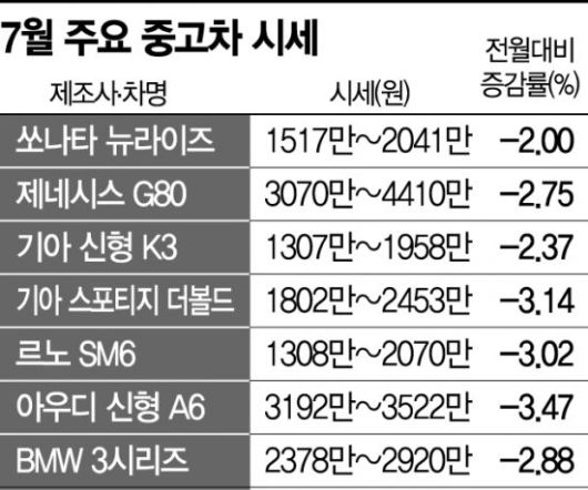 중고차업계 한 관계자는 "국산·수입차 전반적으로 시세 감가폭이 지난달보다 커졌다"며 "여름휴가를 앞두고 중고차 수요가 늘어나는 시기지만 중고차 가격 상승과 유가 폭등까지 맞물리면서 소비심리가 위축된 것으로 보인다"고 말했다.