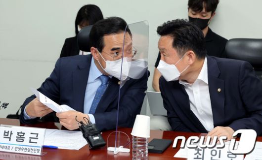 (서울=뉴스1) 허경 기자 = 박홍근 더불어민주당 원내대표가 7일 국회 의원회관에서 열린 화물차 유가보조금 제도 현황 및 개선방안 간담회에서 최인호 화물노동자생존권 보호팀장과 얘기를 나누고 있다. (공동취재) 2022.7.7/뉴스1