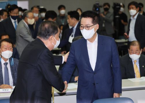 문희상 전 국회의장과 박지원 전 국정원장이 지난 6월 15일 오후 서울 마포구 연세대학교 김대중도서관 컨벤션홀에서 열린 6.15 남북정상회담 22주년 기념식 및 학술회의에서 인사를 나누고 있다.(사진=연합뉴스) |