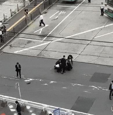 NHK방송은 11시 35분 쯤 트위터로 공유된 영상과 이미지에서 슈트 차림의 사람들이 누군가를 붙잡고 끌고 가는 듯한 장면을 포착했다고 전했다. 또 현장에서 가까이서 찍힌 영상을 보면 아베 전 총리가 쓰러진 가운데 혼란에 빠진 주변인들이 응급처치를 시도하는 모습과, '의료 관계자가 없습니까'라고 외치는 목소리 등을 확인할 수 있다. 통상적으로 일본의 선거운동은 정치인과 유권자 사이의 거리가 멀지 않고 보안 대책도 강하지 않은 편이다.