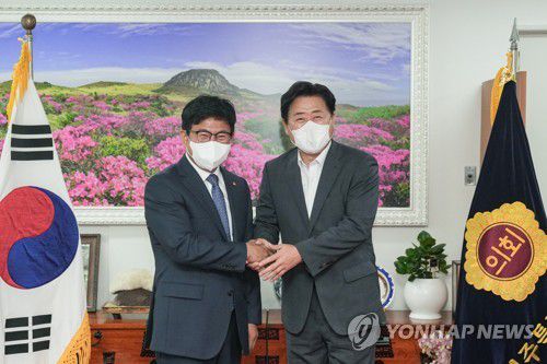 오영훈 제주지사(오른쪽)와 김경학 도의회 의장 |