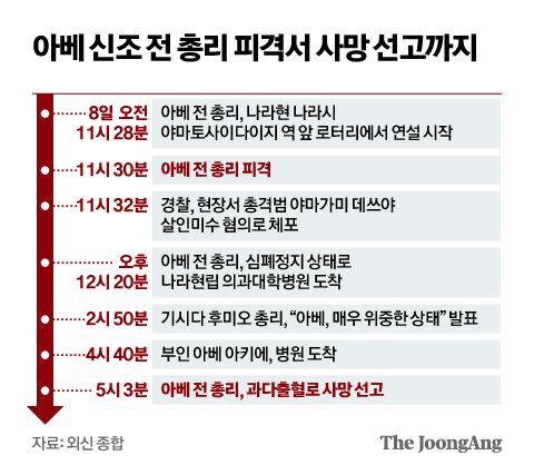 이날 참의원 선거 유세 중 총격을 당한 아베 전 일본 총리가 병원으로 옮겨졌으나 오후 5시 3분 사망이 확인됐다. 일본 언론 보도를 종합하면 아베 전 총리는 이날 아침 도쿄(東京) 하네다 공항에서 비행기를 타고 오사카(大阪) 간사이 공항에 내려 나라로 이동했다. 참의원 선거에 나선 자민당 사토 케이(佐藤啓) 후보의 가두 선거전에서 찬조 연설을 하기 위해서였다.