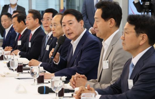 윤석열 대통령이 8일 오후 서울 용산 대통령실 청사에서 열린 제1차 민선 8기 시·도지사 간담회에서 발언을 하고 있다. 대통령실사진기자단 |