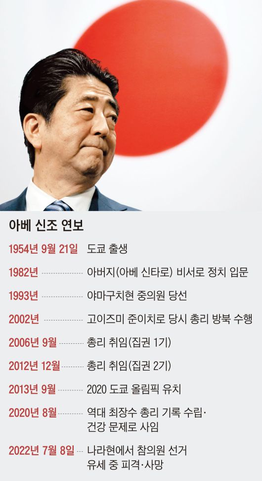 8일 전 해상자위대원에게 피습돼 숨진 아베 신조 전 총리는 ‘전후(戰後) 태생 첫 총리’이자 ‘최장수 총리’로 일본인들에게 각인돼 있다. 친조부부터 3대가 국회의원을 지낸 정치 명문가 출신으로, 외조부는 기시 노부스케 전 총리다. 1993년 아버지 아베 신타로의 야마구치 중의원 지역구를 물려받아 정계에 입문했고, 고이즈미 준이치로 전 내각에서 2001년 관방부장관으로 발탁된 뒤 정치적 입지를 넓혀왔다.