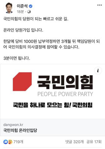 2030세대 '우군'을 앞세운 여론전도 예고했다. 이 대표는 이날 오전 페이스북에 당원 가입을 독려하는 글을 올리면서 "한 달에 당비 1000원 납부 약정하면 3개월 뒤 책임당원이 돼 국민의힘의 의사결정에 참여할 수 있다"고 했다. 윤리위 징계 결정 후 첫 메시지로 자신의 정치 기반인 '청년 당원'을 늘려 우군을 확보하려는 움직임으로 풀이된다.
