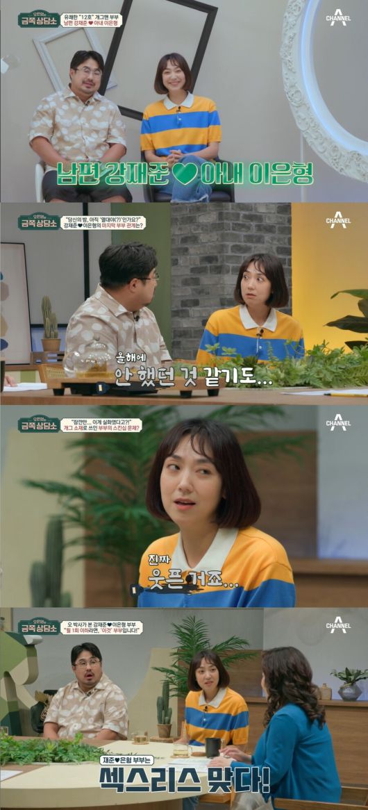 이은형은 "결혼하고 충격을 받은 게 집에서 실오라기 하나 안 걸치고 있다"고 폭로했다. "팬티도 안 입는다"는 강재준을 이은형은 "큰 차우차우라고 생각하시면 된다. 제 눈에는 귀엽지만 밖에서 볼까봐 걱정"이라고 말했다. 그는 "처음에는 너무 충격이었다. 어떻게 다 벗고 있을 수 있지"라고 솔직히 털어놨다. 강재준은 또 '웃찾사' 폐지 후 가게를 시작하면서 체력이 확 떨어진 것 같다면서 "체력도 떨어지고, 참아햐 하는 부분이 있으니 공황장애도 왔다. 많이 힘들었다"고 고백했다. 오은영 박사는 "평소 긴장을 많이 느끼는 사람은 부부관계 사이의 기분좋은 긴장감을 그런 긴장으로 느껴 거부하는 경향이 있다. 반대로 스트레스가 많아 성생활에 몰두하는 경우도 있다"고 설명했다.