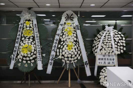 [서울=뉴스핌] 김학선 기자 = 11일 오전 서울 종로구 주한일본대사관 공보문화원에 마련된 아베 신조 전 일본 총리 분향소에 김부겸 전 국무총리의 조화가 놓여 있다. 2022.07.11 yooksa@newspim.com 저작권자(c) 글로벌리더의 지름길 종합뉴스통신사 뉴스핌(Newspim), 무단 전재-재배포 금지