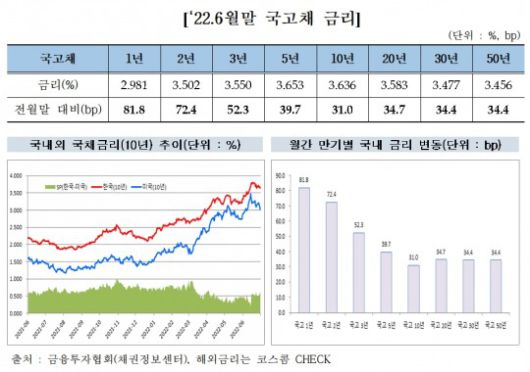 국고채 3년물 금리의 경우 6월 말 기준 3.550%로 전월 말 대비 52.3bp(1bp=0.01%p) 상승했다. 국고채 10년물도 3.636%로 전월말 대비 31bp 올랐다.