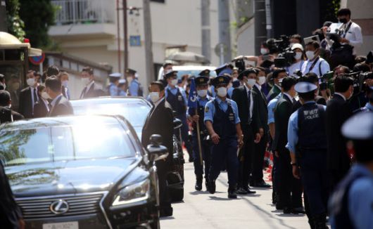 지난 9일 오후 일본 도쿄도 시부야구 소재 아베 신조 전 총리의 자택 앞 골목에 기시다 후미오 총리 일행의 차량이 정차한 가운데 경찰이 경계 근무 중이다. (사진=연합뉴스) |