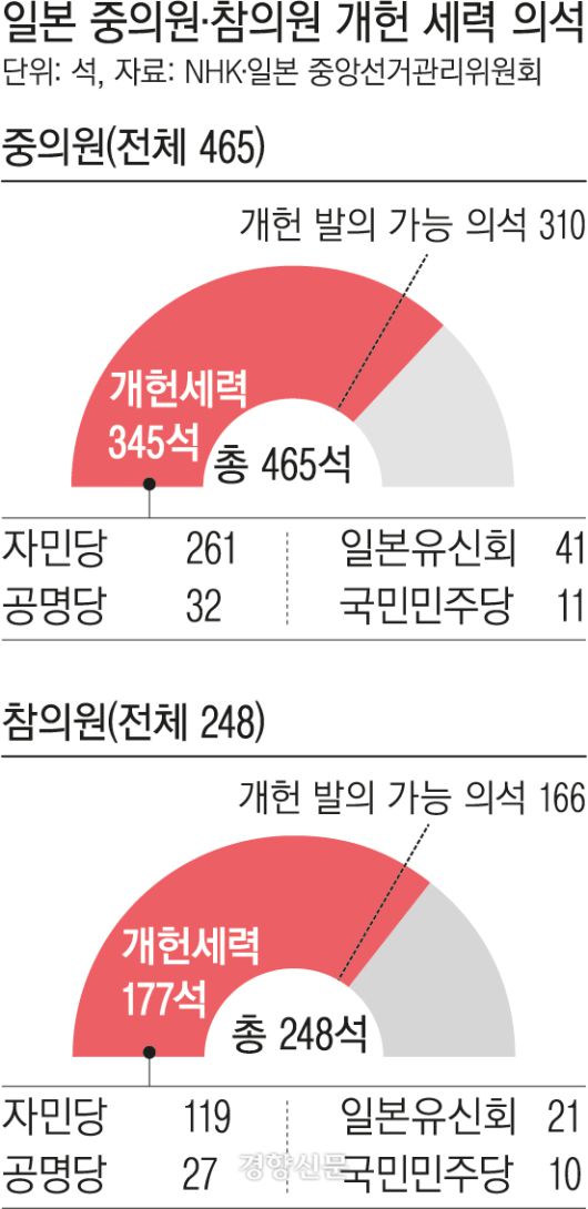 의석수만 놓고 보면 개헌은 어느 때보다 가능성이 크다. 자민당, 공명당, 일본유신회, 국민민주당 등 개헌 세력 4개 정당은 이번 선거 결과 개헌 발의 요건인 전체의 3분의 2(166석)를 여유 있게 넘어서는 177석을 확보했다. 앞서 2019년 7월 참의원 선거에서는 개헌 세력이 3분의 2 의석 확보에 실패한 바 있다. 개헌안을 발의하려면 참의원과 중의원에서 각각 전체의 3분의 2 이상 동의를 얻어야 한다. 개헌 세력은 이미 지난해 10월 선거를 통해 중의원에서 전체의 3분의 2(310석)를 크게 넘어서는 의석을 확보한 상태다.