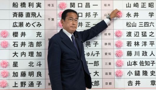 기시다 후미오 일본 총리 겸 자민당 총재가 지난 10일 도쿄 자민당사에서 후보자 이름에 붉은 장미를 달아 참의원 선거 승리를 알리고 있다. 연합뉴스 |