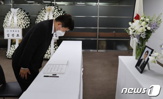 (서울=뉴스1) 국회사진취재단 = 김진표 국회의장이 11일 오후 서울시 종로구 주한일본대사관 공보문화원 아베 신조 전 일본 총리 분향소에서 조문하고 있다. 2022.7.11/뉴스1neohk@news1.kr[© 뉴스1코리아(news1.kr), 무단 전재 및 재배포 금지]
