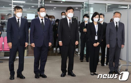 (서울=뉴스1) 국회사진취재단 = 김진표 국회의장이 11일 오후 서울시 종로구 주한일본대사관 공보문화원 아베 신조 전 일본 총리 분향소에서 김한정 의원, 박경미 의장 비서실장 등과 함께 조문하고 있다. 2022.7.11/뉴스1neohk@news1.kr[© 뉴스1코리아(news1.kr), 무단 전재 및 재배포 금지]