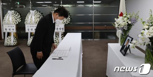 (서울=뉴스1) 국회사진취재단 = 김진표 국회의장이 11일 오후 서울시 종로구 주한일본대사관 공보문화원 아베 신조 전 일본 총리 분향소에서 조문하고 있다. 2022.7.11/뉴스1