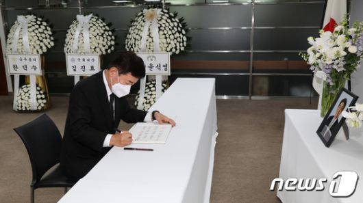 (서울=뉴스1) 국회사진취재단 = 김진표 국회의장이 11일 오후 서울시 종로구 주한일본대사관 공보문화원 아베 신조 전 일본 총리 분향소에서 조문을 마친 뒤 조문록을 작성하고 있다. 2022.7.11/뉴스1neohk@news1.kr[© 뉴스1코리아(news1.kr), 무단 전재 및 재배포 금지]