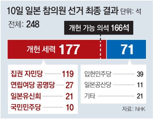 일본 참의원(상원) 선거에서 집권 자민당 등 개헌 추진 세력이 개헌 발의에 필요한 의석수인 3분의 2를 훌쩍 웃도는 의석수를 확보하자마자 기시다 후미오(岸田文雄) 총리가 평화헌법 개정 추진 가속화를 선언했다. 11일 기자회견에서 개헌안 발의에 속도를 내겠다고 공식화했다.