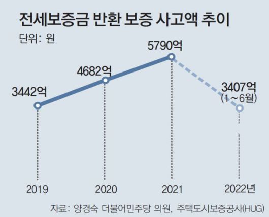 11일 더불어민주당 양경숙 의원이 주택도시보증공사(HUG)로부터 제출받은 자료에 따르면 올해 들어 6월 말까지 발생한 전세보증금 반환 보증 사고액은 3407억 원으로 상반기 기준 역대 최고였다. 사고 건수는 1595건이었다. 2019년 3442억 원이었던 전세보증금 반환 보증 사고 금액은 2020년 4682억 원, 지난해 5790억 원으로 증가하는 추세다. 등록임대사업자의 보증보험 가입이 의무화되는 등 적용 대상 자체가 크게 늘었다는 점을 감안하더라도 증가세가 가파른 편이다.