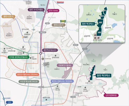 동탄 파크릭스는 반경 5km 내에 SRT 동탄역이 위치해 있다. 이 노선을 이용해 SRT 수서역까지 약 17분에 이동할 수 있어 서울 접근성이 우수하다. SRT 동탄역에 정차 예정인 GTX-A노선이 계획대로 2024년 개통되면 서울 강남 접근성은 더욱 개선될 전망이다.