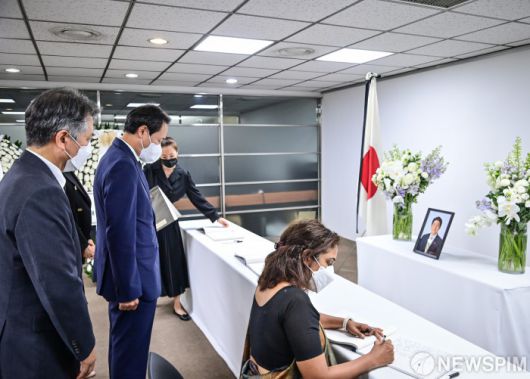 [서울=뉴스핌] 우상호 더불어민주당 비상대책위원장이 12일 서울시 종로구 주한일본대사관 공보문화원에 마련된 아베 신조 전 일본 총리 분향소를 조문하고 있다. [사진=더불어민주당] 2022.07.12 photo@newspim.com 저작권자(c) 글로벌리더의 지름길 종합뉴스통신사 뉴스핌(Newspim), 무단 전재-재배포 금지