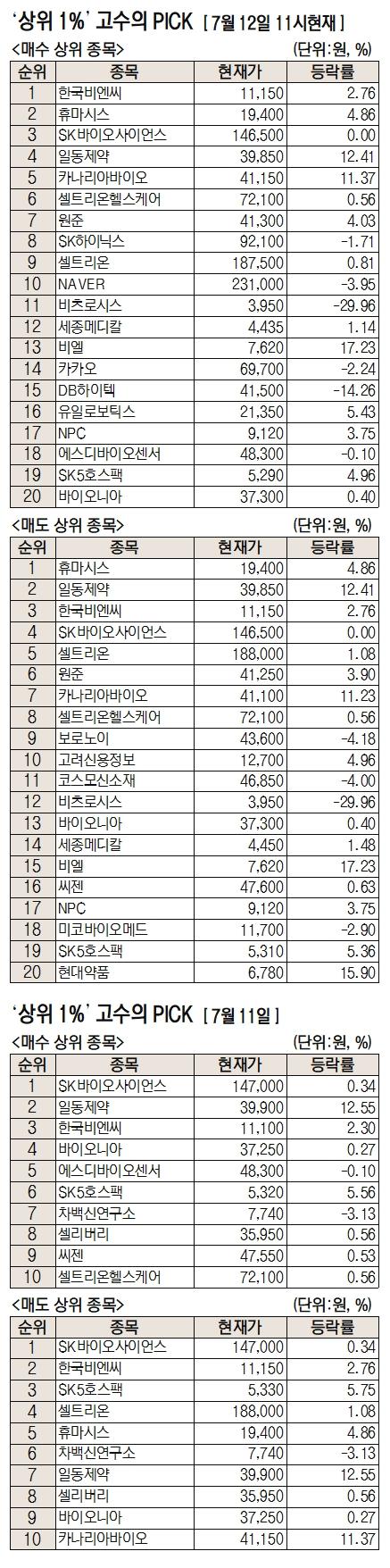 전 거래일인 11일 매수 1위 종목은 SK바이오사이언스였다. 일동제약, 한국비엔씨, 바이오니아(064550), 에스디바이오센서(137310)에도 투자심리가 몰렸다. 반면 매도 1위 종목 역시 SK바이오사이언스였다. 한국비엔씨, SK5호스팩(337450), 셀트리온, 휴마시스가 그 뒤를 이었다.