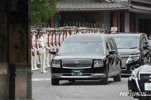 [도쿄=AP/뉴시스] 아베 신조 전 일본 총리의 시신 운구 차량이 12일 일본 도쿄의 국회의사당을 지나가고 있다. 2022.07.12. |