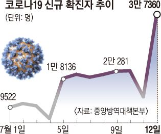 코로나19 신규 확진자가 4만명대에 육박했다. 12일 0시 기준 3만 7360명에 이어 이날 오후 9시까지 3만 8734명을 기록했다. 1주일 전인 7월 5일(1만 8136명)의 2.1배, 2주일 전인 6월 28일(9894명)의 3.9배나 된다. 이대로라면 다음달 하루 신규 확진자가 20만명에 이를 수 있다는 관측도 나온다. 방역당국은 전국의 주간 코로나19 위험도를 8주 만에 ‘낮음’에서 ‘중간’으로 올렸다.