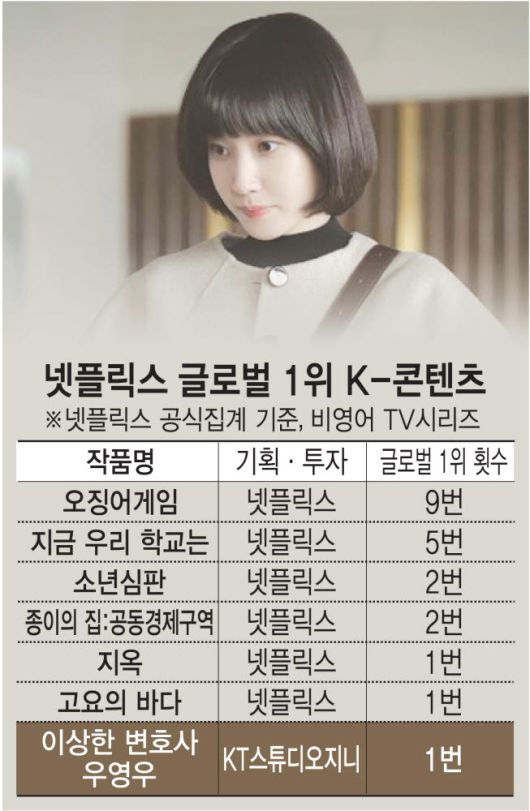 KT 콘텐츠 도전이 세계시장에서 통했다. KT스튜디오지니가 기획한 스카이TV 채널 ENA 드라마 '이상한 변호사 우영우'가 넷플릭스 글로벌 1위에 올랐다. '이상한 변호사 우영우'는 넷플릭스가 13일 공개한 지난 4~10일 190여개국에서 가장 많이 본 비영어 TV시리즈 글로벌 1위를 기록했다. 글로벌 톱10 진입과 동시에 1위 직행으로 지난달 29일 ENA 채널과 KT 온라인동영상서비스(OTT) 시즌, 넷플릭스에서 공개된 지 2주 만의 성과다.