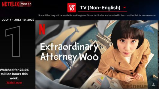 '우영우'는 지난주 일본, 인도네시아, 싱가포르, 태국, 필리핀 등 12개국에서 톱10에 올랐다. 우리나라와 대만, 베트남에서는 1위다. 일주일 동안 글로벌 총 시청시간은 2395만시간으로 2위와 587만시간 격차를 보였다. 13일(현지시간)부터 유럽·남미 국가에서 31개 언어로 추가 공개될 예정으로, 글로벌 흥행이 지속될 공산이 크다.